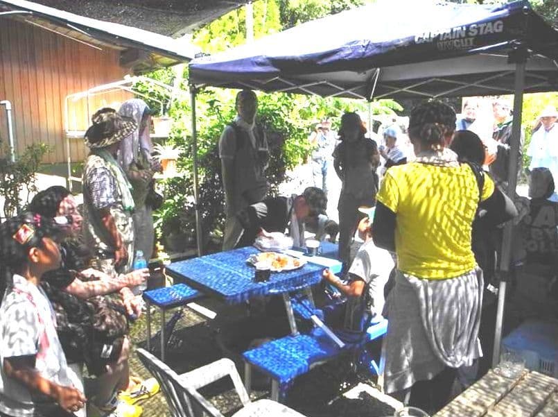 旧本城中学校で昼食のふるまいを受けたあと、ゴミ袋を持参してフットパスに臨みました。
